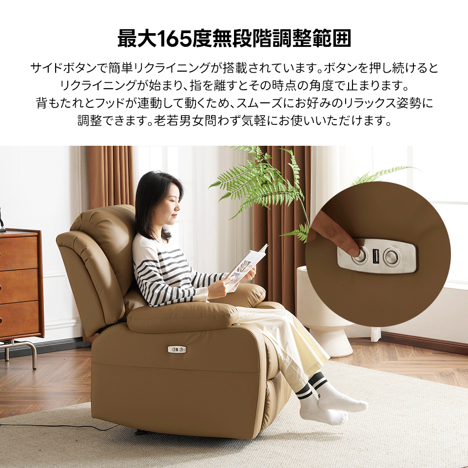 ◆01電動リクライニングソファ たっぷり詰め込まれたふわふわの綿で快適な座り心地。 思わず“沈み込む”ような、極上のリラックス空間。 高さ調整が可能な便利なテーブル付き。 ソファ耐荷重:130kg ◆02 64〜74cmの間で高さ調整が可能なテーブル テーブル耐荷重:3kg 高さ調整が可能なテーブルは、差し込むだけで簡単にセットします。64〜74cmの間でお好みの高さに調節し、使わない時は取り外してすっきり収納できる便利な設計です。 テーブルは回転式で、用途に合わせて自由に調整可能。仕事や読書、テレビ鑑賞など、シーンに応じて快適にお使いいただけます。 ご注意 1.本を読んだりテレビを見たり、パソコンを使ったりする際は、重すぎる物は避けてください。重い物を置くと、板が曲がる恐れがあります。 2.片側のみ調整可能です。最大角度に調整する際は、テーブルの傾斜にご注意してください。 3.テーブルを使う前に、しっかり固定されているか確認してください。安定しない状態で物を置かないようにご注意してください。 ◆03最大165度無段階調整範囲 サイドボタンで簡単リクライニングが搭載されています。ボタンを押し続けるとリクライニングが始まり、指を離すとその時点の角度で止まります。背もたれとフッドが連動して動くため、スムーズにお好みのリラックス姿勢に調整できます。老若男女問わず気軽にお使いいただけます。 調整の際には、ソファの長さが変わる点にご注意ください。調整前の全長は約76cmですが、リクライニングを最大にすると約162cmまで伸びます。ソファと壁の間には少なくとも41cmの距離を保つことをお勧めします。設置スペースを確保し、周囲の家具や壁との距離を考慮してご利用いただくようお願いいたします。 ※角度を調整する際には、 周りに小さな子供やパットがいないことに気を付けてください。誤って彼らに怪我をさせてしまうことがないようにするためです。 ◆04座る、寝る、楽しくになる 座面 体にフィットするよう設計された座面は、自然に下へ沈み込む構造で、快適さと人体工学に基づいたサポートを両立します。 背もたれ 背もたれはまるでふっくらとしたパンのような形状で、柔らかく体を包み込みます。 フットレスト フットレストをしっかり支えることで、全身がリラックスできる構造です。 このような座り心地の良さを実現しているのは、使用している素材がしっかりしているからです。 PP綿がしっかりとした支えを提供し、コットンが柔らかな座り心地を実現。2つの素材を絶妙に組み合わせることで、快適さとサポート力を両立させた理想的な座り心地を生み出します。 座面の通気性を高める優れたSパネルパンチングと高い弾力性が特徴のコイルばねを含まれて、しっかりと体を支えつつ、弾力のある快適な座り心地を実現します。 ◆05包み込まれる柔らかく心地 体の部位ごとに最適な曲線と柔软性を設計し、全方位て 身体によりフイットする圧カ分散を実現します。 座っても、寝転んでも、頭から足先まで至高の快適です。 ◆06USB充電口搭載 USB充電口搭載で、スマートフォンの充電がソファに座ったまま手軽に行えます。くつろぎながら、いつでも快適にデバイスを使用できます。 ※電動ソファの充電ポートは出力が低いため、ノートパソコンの充電には対応していません。タブレットの充電が対応できない場合もあります。 ◆07便利なサイドポケット 便利なサイドポケットが付いています。ソファの側面に配置されており、リモコンやスマートフォン、本や雑誌などの小物を収納するのにぴったりです。 ◆08電源収納スペース コードを使わないときは、裏のカバーをめ<れば中に収納ができます。 マジックテープ式ですのでめくれる心配もありません。 ご注意 ケーブルがフレームむに圧迫されて折れる可能性がごさいますので、 白い結束パンドを外しないでください。そのままご使用いただけますようお願い申し上げます。