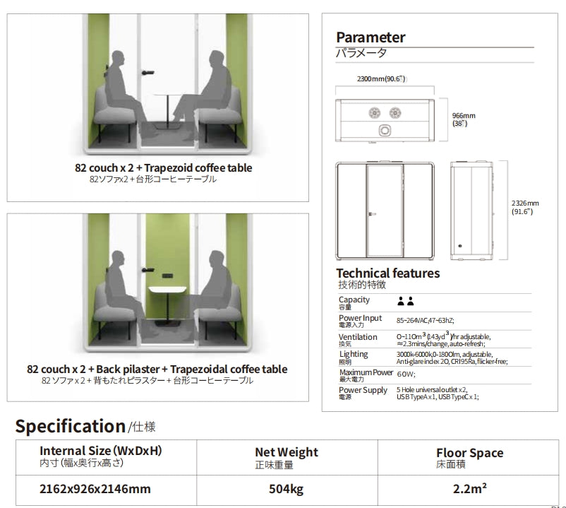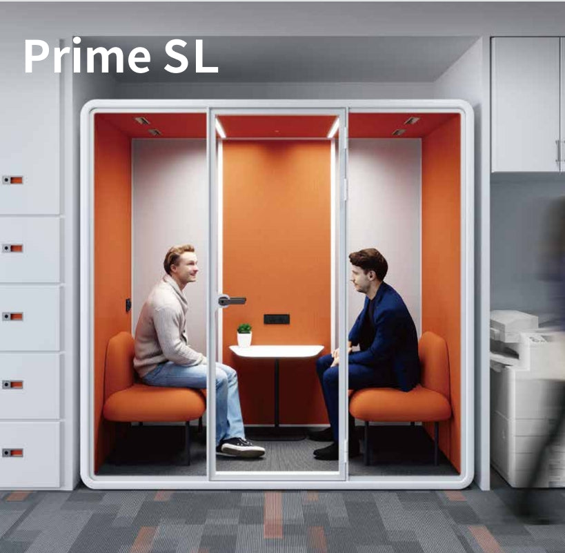 SLモデルは、狭小スペースでも最大限の使いやすさを追求した2人用の対面型防音ポッドです。例えばオフィスの廊下や隅など、通常は活用しにくい空間に設置可能。わずか幅2.3m × 奥行1.0mというスリム設計ながら、しっかりとした防音性と快適な居心地を両立します。